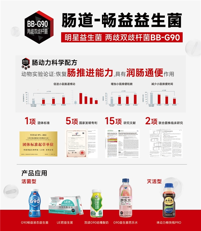 叶育彬:咕噜酸奶的诞生,不只是为了做一款“新口味”,更是为了一个真实的健康需求——肠道通畅。目前市面上的很多酸奶,只解决了口感需求,而体感需求还有待提升。均瑶健康的食饮产品始终坚持一个原则:不止美味,更有健康。这里面的健康,除了清洁的配方,还要有体感、有效果,有科学支撑。因此,我们选择了G90两歧双歧杆菌。根据实验数据显示:G90能在肠道代谢产生乳酸,有效抑制有害菌,增强肠道蠕动,并提升粪便含水量。当它与另一株菌G80联用时,更能显著增加排便次数、缩短首次排便时间。这些由实验数据验证的功能表现,使G90相关研究成果已发表多篇SCI论文,并获得2项发明专利。