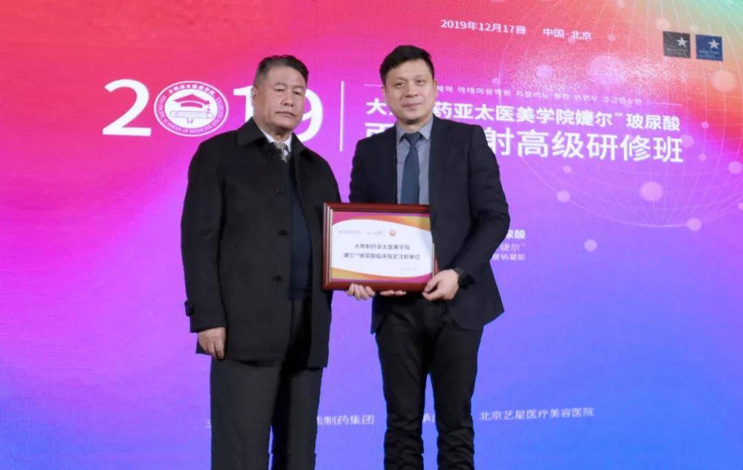 △ 刘永杰先生授牌于宗树亭院长 北京艺星医疗美容医院 成大熊制药亚太医美学院 婕尔™玻尿酸临床指定注射单位