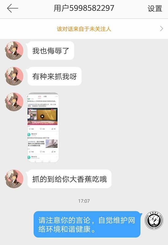 四川凉山州公安局官方微博4日通报称,4月3日,新浪微博网民“伪大大12”转发《凉山木里森林火灾30人不幸牺牲》等多条新闻并发布“腊鸡消防员死的活该连火都灭不掉”、“果然是凉山人作恶多端引起老天愤怒没毛病”等侮辱救火英雄言论,随后,该人私信“凉山公安”官方微博挑衅称:“我也侮辱了,有种来抓我呀”、“抓的到给你大香蕉吃”公然挑战警方,态度极为嚣张,影响极其恶劣。